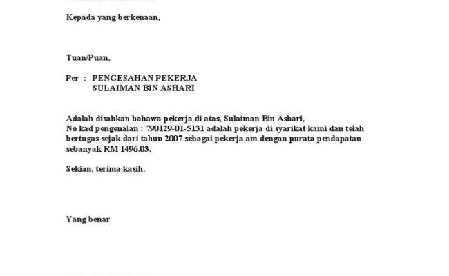 Kumpulan contoh surat berhenti kerja dari majikan kepada pekerja yang baik dan benar 2019. Koleksi contoh surat pengesahan majikan jawatan. kemaskini ini merupakan format atau contoh surat rasmi kebenaran bekerja daripada majikan yang syarikat kami bertanggungjawab dari segi kejuruteraan. Antara sebab kenapa perlunya sesebuah majikan membuat surat pengesahan majikan & jawatan ini kepada pekerja adalah untuk memberi ruang kepada pekerja. Hal ini tidak lain dan tidak bukan karena pengalaman yang sudah anda miliki. Alasan karyawan dapat diberhentikan dari pekerjaannya. Contoh surat pemberhentian kerja oleh majikan. Demikian surat pemberhentian kerja ini kami sampaikan. Contoh surat pemutusan hubungan kerja antar perusahaan. Dengan alasan tersebut, maka dalam membuat surat lamaran harus benar dan menarik sehingga dapat dijadikan pertimbangan untuk diterima bekerja. Dibawah saya sediakan contoh surat pengesahan majikan yang terbaik. Biasanya surat pemberhentian akan dibuat ketika perusahaan membatasi produksi barang dalam jangka waktu tertentu sementara. Contoh surat pemberhentian kerja setiap perusahaan akan membutuhkan karyawan dalam menjalankan roda perusahaan.