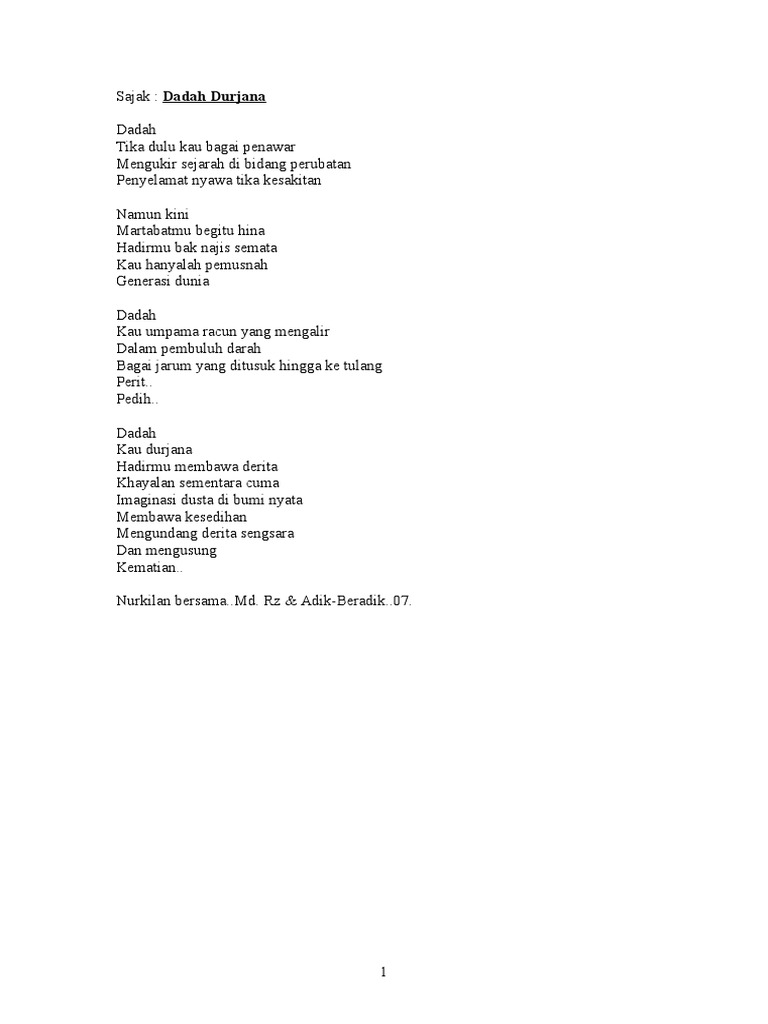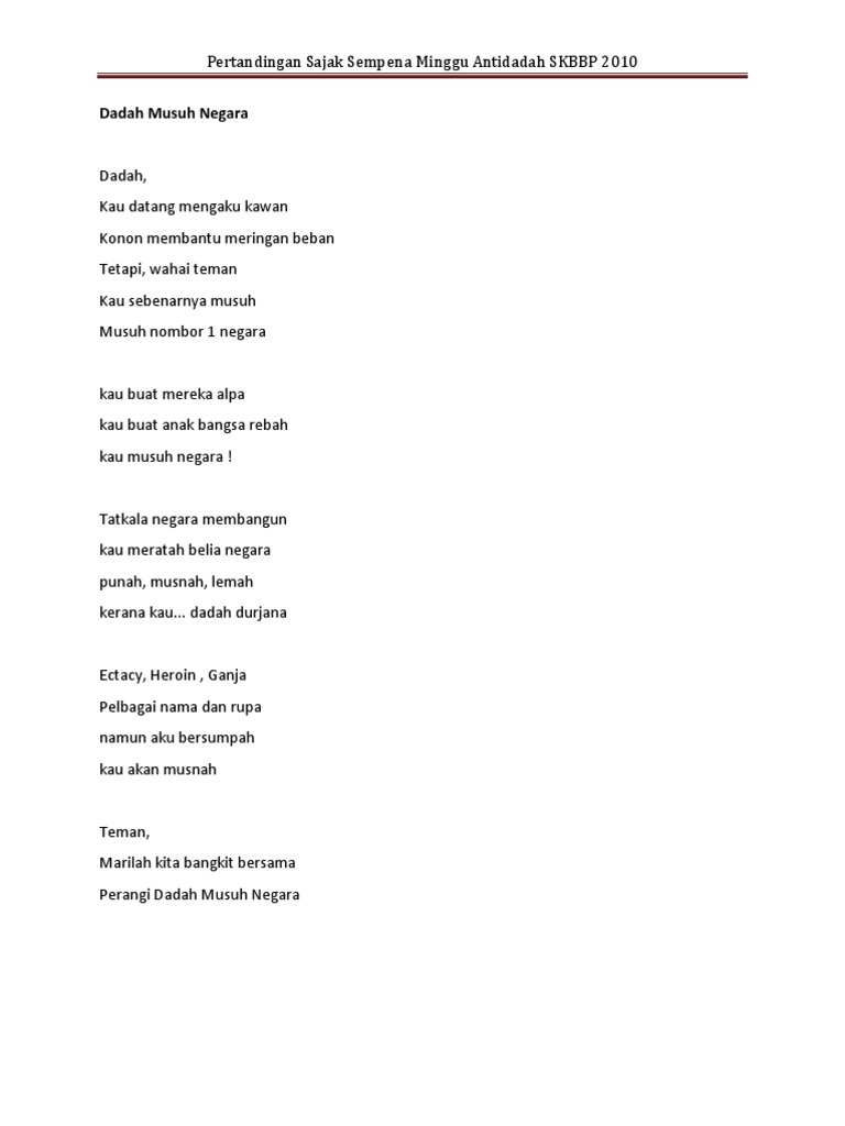 Sajak Anti Dadah from imgv2-2-f.scribdassets.com $eterusnya majlis menjemput adik (!rsya5i?ah adila bt. Tik.tik.tik waktu terus berdetik ragam manusia satu demi satu tercipta. Meningkatkan kesedaran murid tentang bahaya dadah. Gambar ini di ambil dari pemilik berikut : Menyemai sikap positif agar murid prihatin. Agensi antidadah kebangsaan (aadk) daerah cheras. Pertandingan deklamasi sajak antidadah sekolah rendah mp3 duration 2:46 size 6.33 mb sajak antidadah by dhaaniya pirabo mp3 duration 1:55 size 4.39 mb / dhd fun world 8. Dadah durjana | lagu untuk program anti dadah sekolah.